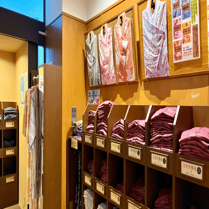 浴衣は入口で好きな種類や色を選べるスタイルで、そのちょっとした楽しみも万葉の湯ならでは。