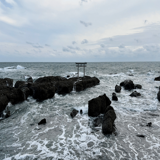 潮風に包まれながら、波しぶきとともに立つ鳥居の姿はまさに圧巻