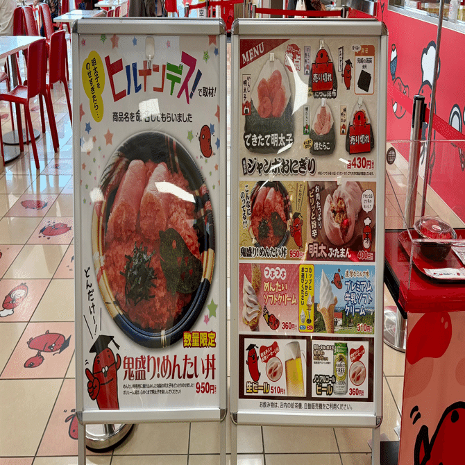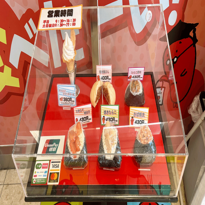 館内では、ジャンボおにぎりや明太豚まん、明太ソフトクリームなど、明太子を使ったグルメが勢ぞろい🍦